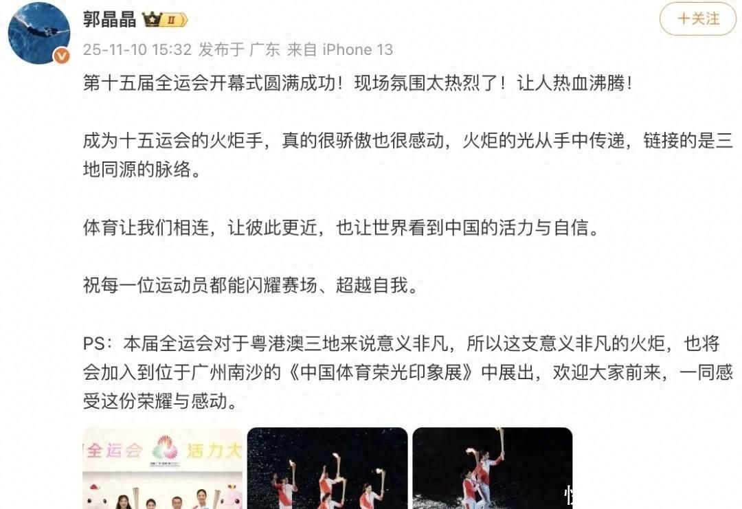 仅仅四天后,又一项国家级荣誉接踵而至——11日,第十五届全运会圣火在广东奥体中心点燃并开始传递,第三棒火炬手正是郭晶晶。